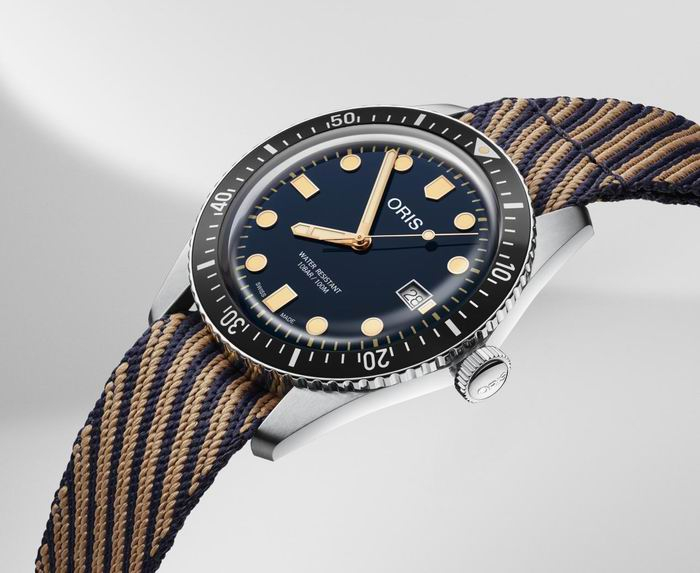 豪利时65年复刻版潜水腕表搭配再生塑料表带。
