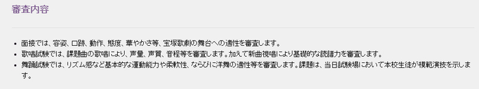 面试考察容貌、口齿、动作、态度、气质,以确定候选人和宝冢歌剧舞台的适配性。