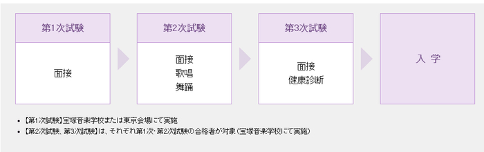 宝冢音乐学校的招生考试方式并不复杂,官网上清晰明了地写着就3轮,初试-复试-终试+体检。