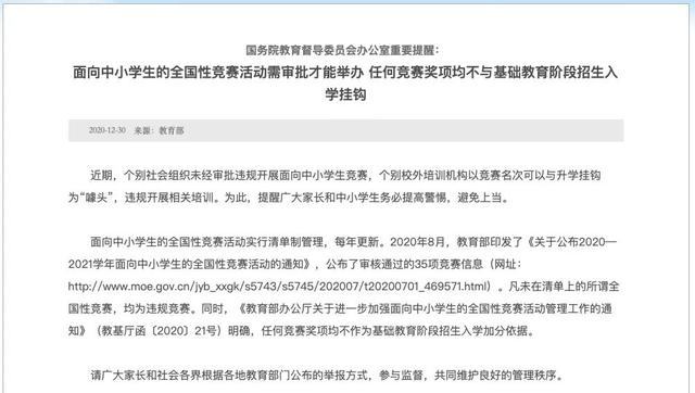 2020年12月,教育部网站发布《面向中小学生的全国性竞赛活动需审批才能举办,任何竞赛奖项均不与基础教育阶段招生入学挂钩》的重要提醒。其中明确,面向中小学生的全国性竞赛活动实行清单制管理,每年更新。