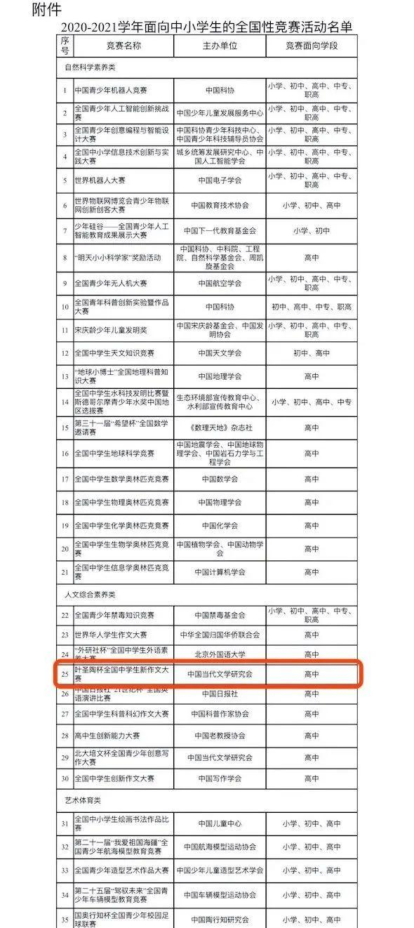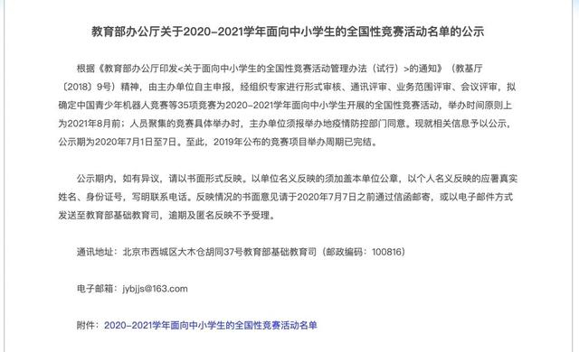2020年8月,教育部印发了《关于公布2020—2021学年面向中小学生的全国性竞赛活动的通知》,公布了审核通过的35项竞赛信息。凡未在清单上的所谓全国性竞赛,均为违规竞赛。