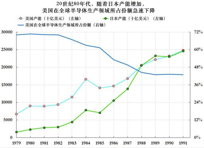 在20世纪80年代,随着日本产能增加,美国在全球半导体生产领域所占份额急速下降