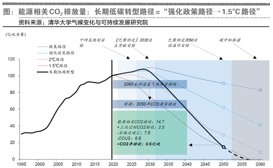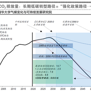 华泰证券认为,上述四种路径面临的两难在于:一方面,长期执行“政策路径”或“强化政策路径”无法实现《巴黎协定》2050年最低温升要求,也无法实现碳中和承诺;另一方面,如果减排路径直接向2℃或1.5℃路径靠拢,由于能源与体系的惯性以及经济稳增长的需要,执行可行性低。因此,清华大学气候研究院建议的“长期低碳转型”路径是上述基础路径的叠加:2030年前执行“强化政策路径”,其后加速向“1.5℃路径”靠拢。在“长期低碳转型”路径下,中国将于2050年基本实现二氧化碳净零排放,于2060年实现全部温室气体净零排放(碳中和)。因此,碳中和承诺实质上并非2060年才得以验证的“远期支票”,要兑现这一承诺,2030年前中国需要看到二氧化碳排放量拐点出现。