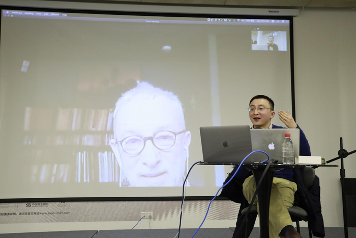 杨振在活动现场,大屏幕上的是安德列·居约