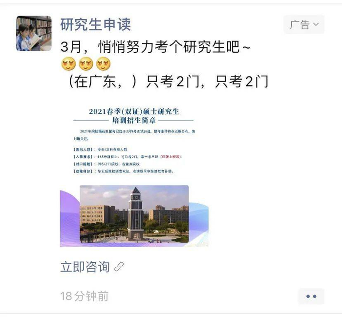 这世界上,比你更确切知道你需要考个研究生的,是朋友圈的研究生广告。好家伙,我坚信她的小男友也看到过类似这样的广告。