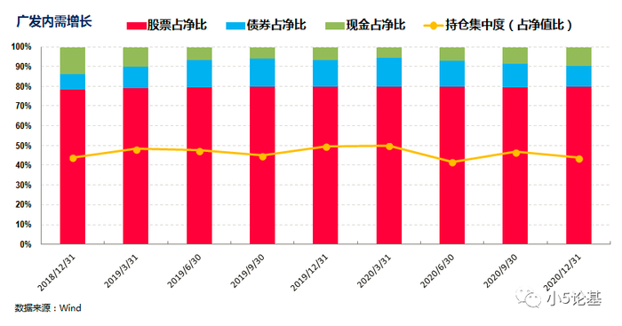 上图是王明旭管理的广发内需增长的资产配置情况图。