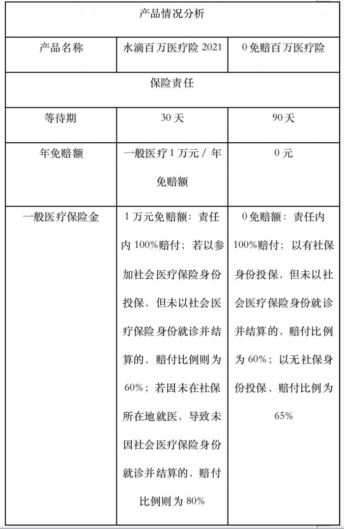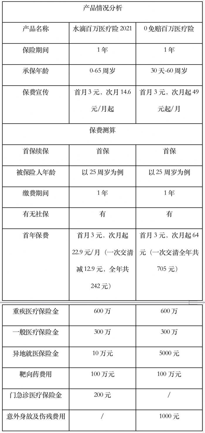 对于这些百万医疗险的性比价,我们选取了水滴保险商城在售的两款百万医疗险“水滴百万医疗险2021”(由中国人民财产保险承保)以及“0免赔百万医疗险”(由京东安联财产保险承保)进行测评。
