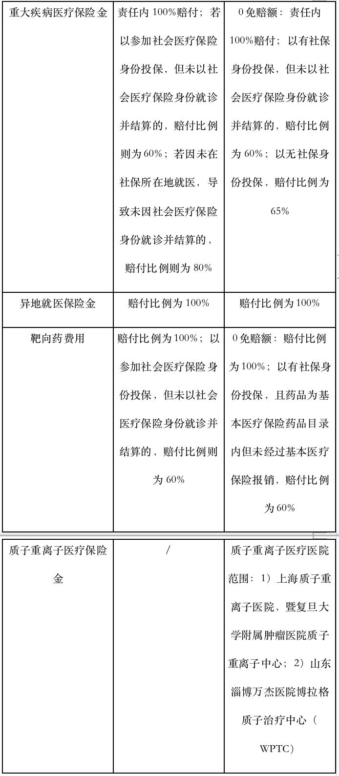 “0免赔百万医疗险”合作两家质子重离子医疗医院,分别为上海质子重离子医院(暨复旦大学附属肿瘤医院质子重离子中心)以及山东淄博万杰医院博拉格质子治疗中心(WPTC)。被保险人在上海质子重离子医院接受质子重离子治疗所支付的医疗费,按照100%比例给付重大疾病医疗保险金,床位费以1500元/天为限。但不承担被保险人在上海质子重离子医院接受化学疗法、肿瘤免疫疗法、肿瘤内分泌疗法和肿瘤靶向疗法所产生的治疗费用。