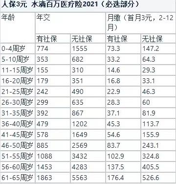水滴保险商城客服提供的保费详情显示,“水滴百万医疗险2021”在11-15周岁有社保月缴保费最低,为14.6元,而61-65周岁月缴保费则超出最低保费的12倍。