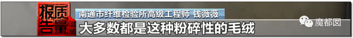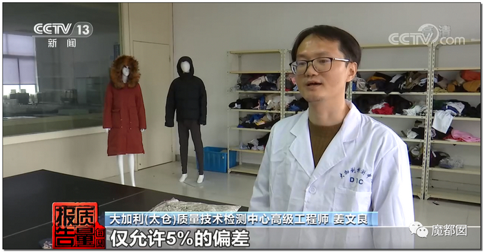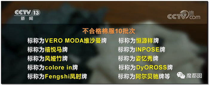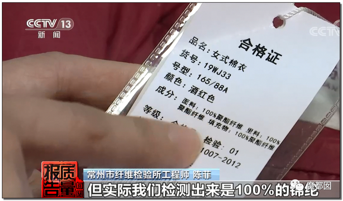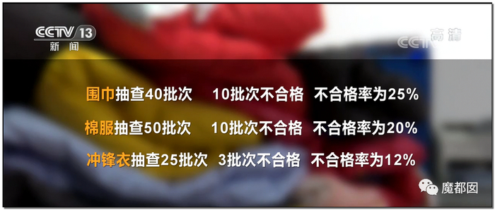 大家要知道,12.3%是一个平均不合格率,细化到具体的项目里面就更夸张,围巾不合格达到了25%,外面4条围巾就有1条不合格,这是什么概念?简直胡闹……棉服是20%不合格,5件棉服就有1件不合格。