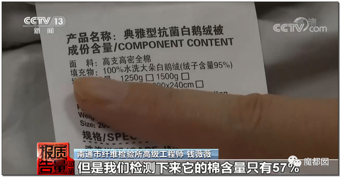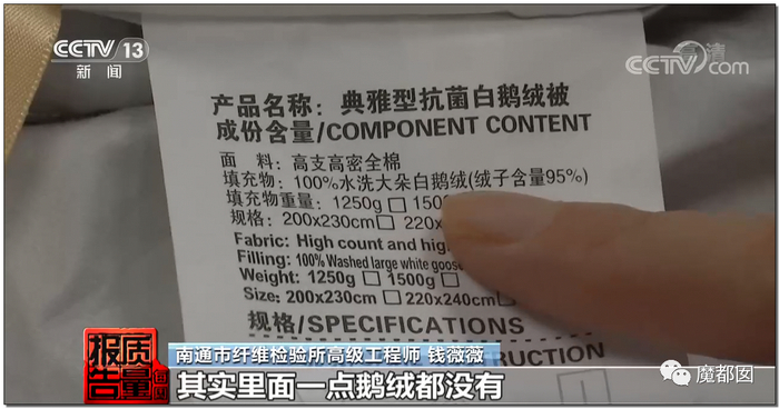 最重要的4项指标都不合格,羽绒含量、纤维、蓬松度等等,完全就是一劣质假货。