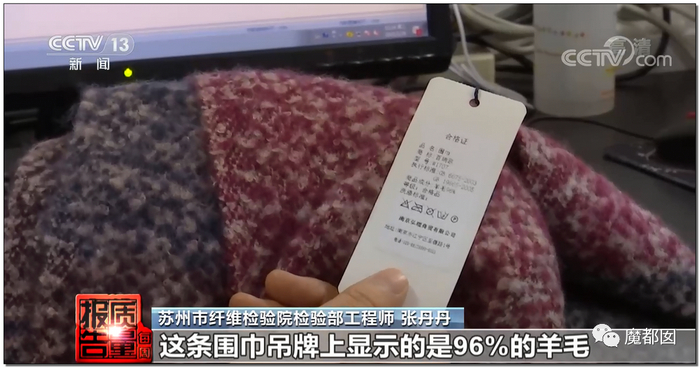 比如这条羊毛围巾,吊牌显示羊毛96%。