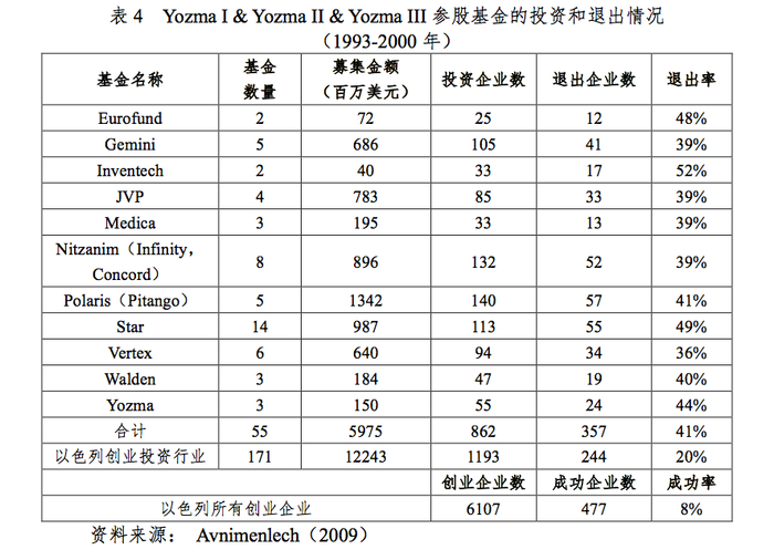 三期Yozma设立后,截至2008年,所有Yozma基金所参股的55只市场化创业投资基金共募集到59.75亿美元,相当于同期以色列创业投资行业募集金额(122.43亿美元)的49%。这些参股基金共投资862家创新型企业,成功退出 357家,退出率为41%,比同期以色列创业投资行业退出率(20%)高出21个百分点。这一退出率也远高于同期以色列所有创业企业8%的成功率。
