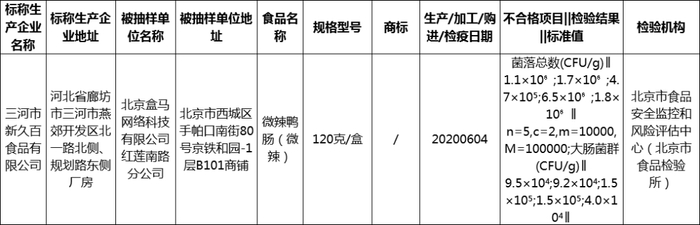 公告信息显示,标称三河市新久百食品有限公司生产,北京盒马网络科技有限公司红莲南路分公司经营的微辣鸭肠(微辣)(120克/盒、20200604),菌落总数、大肠菌群不符合食品安全国家标准,菌落总数(CFU/g)检验结果为1.1×10⁶;1.7×10⁶;4.7×10⁵;6.5×10⁶;1.8×10⁶,标准值为 n=5,c=2,m=10000,M=100000;大肠菌群(CFU/g)检验结果为9.5×10⁴;9.2×10⁴;1.5×10⁵;1.5×10⁵;4.0×10⁴,标准值为n=5,c=2,m=10,M=100。