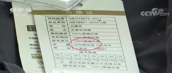 南通市纤维检验所 高级工程师 钱薇薇:吊牌上标称绒子含量95%,而检测下来只有7.8%,严格来说,这连羽绒被都算不上。国家标准要求,绒子含量要大于等于50%,才能称为羽绒被。