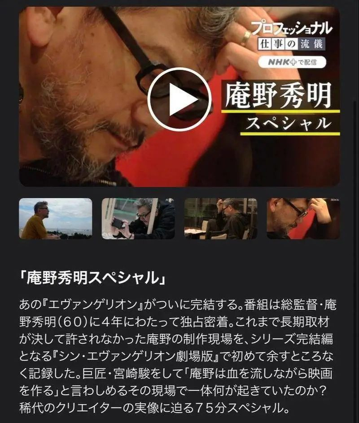 2021年3月22日晚,NHK综合频道的纪录片《Professional 工作的流派 庵野秀明特别节目》在日播出。该片官网引用了宫崎骏的这么一句话: