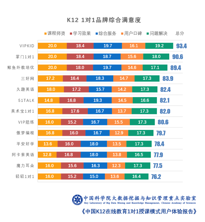 第五,凭借对课程体系的不断打磨,VIPKID打造了差异化的课程体验。中科院发布的1对1品牌满意度调查研究结果显示,VIPKID得分93.4分名列第一,在各个小项上的得分也均具优势。同时VIPKID也成为本次调研中唯一获得全优评价的1V1品牌。浙江省消费者权益保护委员会此前对12家在线教育平台的课程品质、优质服务和信息披露三大维度进行综合评价,VIPKID以95分位列第一。