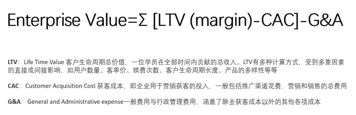 在整个公式中可以明确看到,一家在线教育机构的主要收入,就是客户生命周期总价值(LTV),而主要成本则是获客成本(CAC)和一般及行政管理费用(G&A)。其中,一般及行政管理费用相对固定,通常都有市场公允价值,不会出现大幅波动。