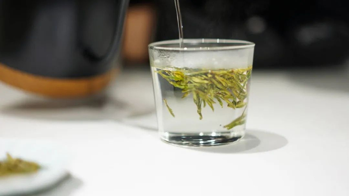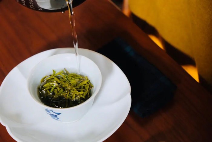 3、茶叶吸水后一片一片慢慢下沉,茶汤颜色也慢慢显现出来,等汤色明绿就可以品饮了。