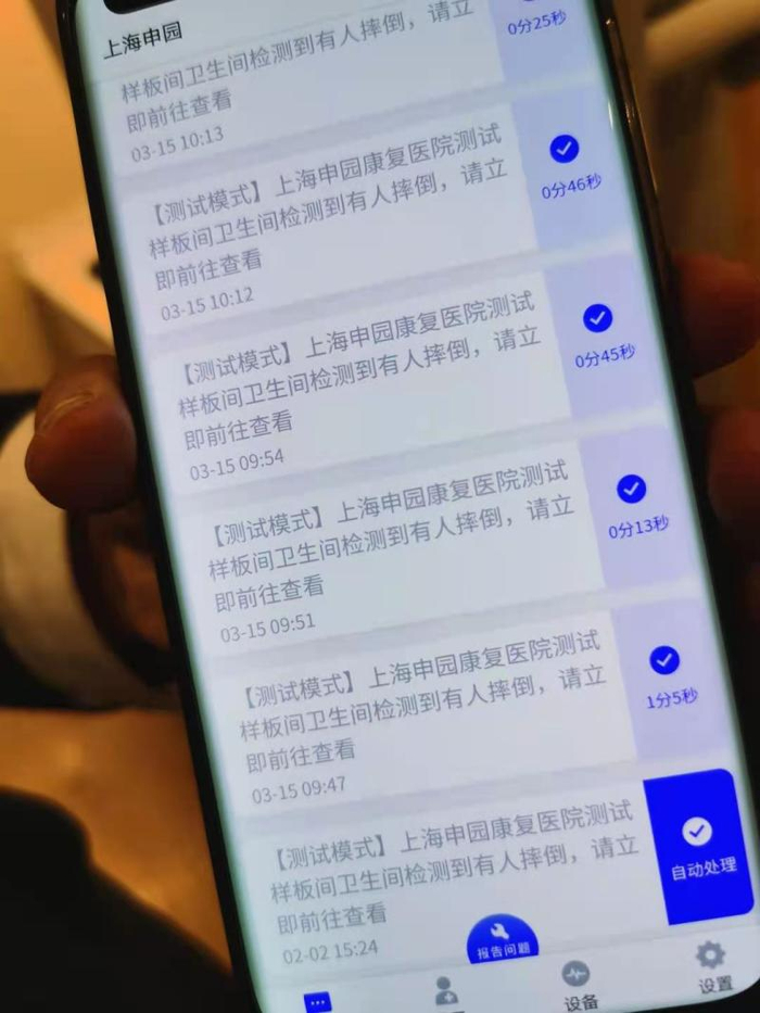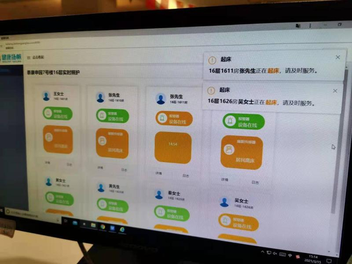 最终,所有信息都会推送到区域管家的手机、前台护理区屏幕上。工作人员可根据设备预警及时作出反应。