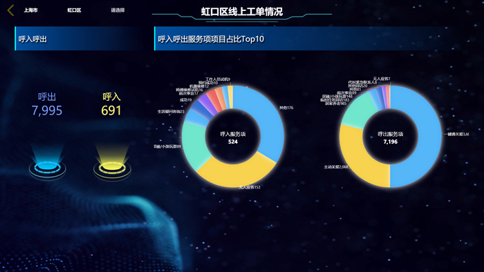 他介绍,虹口区“一键呼叫”电话机的普及率较高。由政府向企业购买服务。天与养老的平台系统可实时显示一系列大数据图表,比如当天已接到多少单老人拨打的电话服务、各类型服务占比多少等。