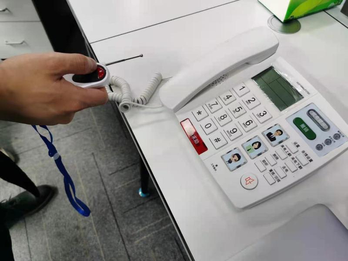 更重要的是,每台电话机都有一个红色的“一键呼救”按钮,同时配有随身携带的遥控器,若老人发生意外,可立即按下电话机或遥控器上的红色按钮,第一时间向平台求助,平台会立即联络社区干部上门查看,或呼叫120急救车辆。