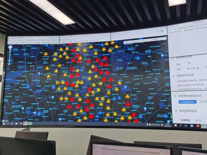 柳营路8号,是上海天与养老服务有限公司的一个营业网点。办公室的大电子屏上,正显示着虹口区的地图,地图上分布着密密麻麻的小圆点。