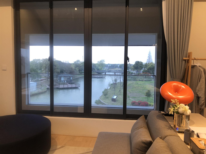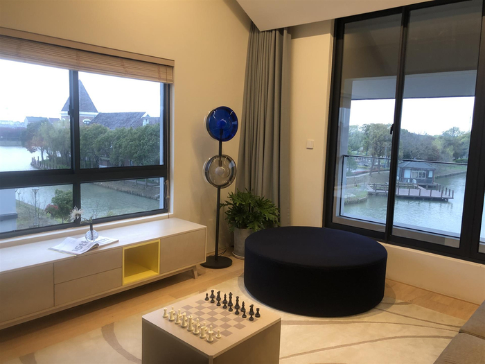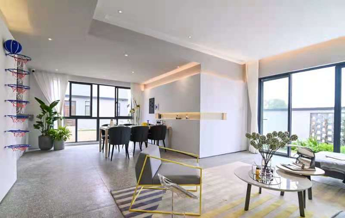 他们的办公场所,就在两面临水的农民集中居住点里。春节前,38户农民搬入新房,配套的4套农宅被乡伴文旅集团租下,一套被改建成了马利艺术美学中心,可以让年轻人体验闲暇慢生活,又可以埋头思考创作,剩余的则被打造成了复古、潮玩等风格的8间精品民宿,在春节试营业期间一房难求,被许多客人赞为“在沪郊见过的最美民宿”。