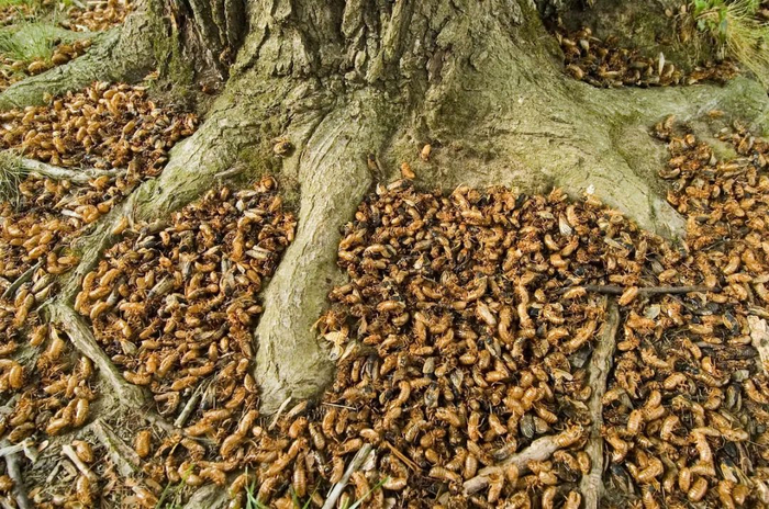 这些虫子在交配和死亡之前只在地面上生活了几周,它们的褐色的蝉蜕到处都是,从灭虫标志上到纽约州的Storm King艺术中心的雕塑上。