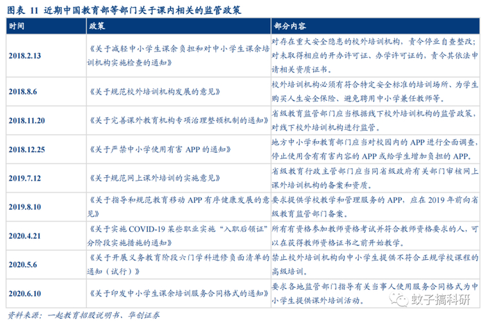 目前在中国实践校外自适应教育进入校内,首先面临的一大障碍是政策上的障碍。对于校内中小学生使用 APP,使用手机等信息化的工具,以及校外培训机构对校内的渗透,中国教育主管部门是高度谨慎的。一起教育是一家主打校内免费工具+校外辅导导流的公司,其在招股说明书中列举了国内最近两年和公司有关的监管政策: