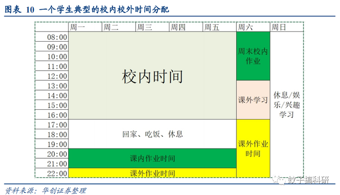 在校内做自适应教育,相比在校外做自适应教育,其天然优势在于数据的丰富度大大提升。在国内,课外教育的主要时间段依然是以周末为主,但周末本身还要留时间给休闲 娱乐和兴趣素质拓展教育。而工作日时间段校内教育占据白天时间,夜晚还要考虑校内作业时间,校外的课程和作业时间也很难争夺主导地位,我们粗略估算的一个学生典型 的校内和校外教育的时间分配见下图: