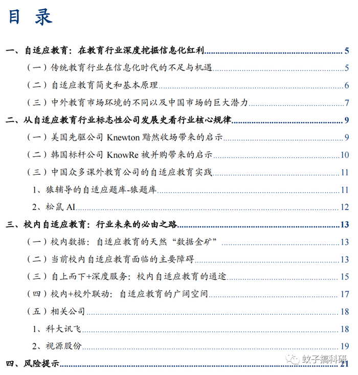 ✔ 风险提示:自适应教育在公立教育体系内推广不力;校内校外数据存在政策风险;行业竞争加剧带来价格竞争和盈利能力下降。