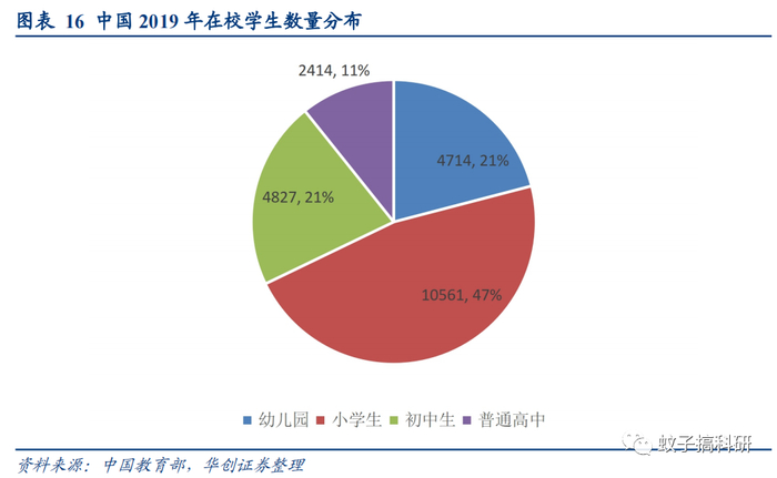 从更长期的机会看,我们认为自适应教育的未来是校内的数据积累+校外的辅助提升市场联动。对于自适应教育在校内市场积累的数据,其在校外有着巨大的可变现空间。下图展示了 2019 年全国在校学生的人数分布:
