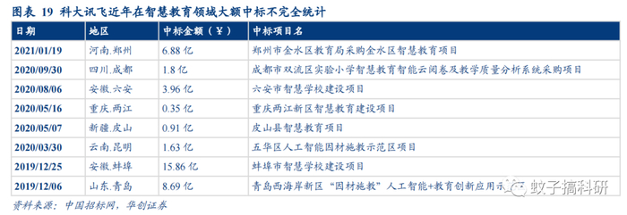 科大讯飞自创立伊始长期在语音和 AI 技术这一赛道长期积累,目前已经探索出基于 AI自适应教育的“因材施教”技术和解决方案体系,并在全国各地探索推广。最近几年的智慧教育相关大额订单不完全统计见下表。科大讯飞的区域级试点项目在全国各个省市 的试点均全面铺开,并没有显示出显著的地域限制。