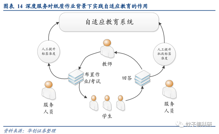深度服务:用现有的人工智能技术,在处理纸质作业,不管是给题目打标签还是批改学生主观/问答题/证明题并打标签,都存在很大的准确率缺陷,导致整个自适应教育系统无法形成信息流闭环,没有实用性。科大讯飞摸索出的方法是增加驻校的服务人员,用(远程)人工来弥补 AI 的不完善,一线人工辅助完成题目录入,远程的教研团队人工服务辅助教师完成题目的精确标签;