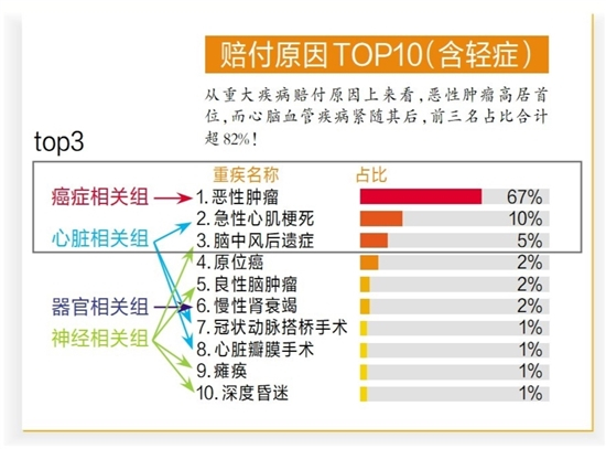 条款上,平安六福将其保障的120种重疾分为恶性肿瘤相关、心脏相关、器官相关、神经系统相关、呼吸系统相关、其他疾病6组,每组重大疾病均可获得一次重大疾病保险金赔付,累计最高可赔付6次(间隔期1年,首次重疾保至终身,第二至第六次保至80岁)。通过加工了一下“平安人寿2020年理赔年报”中的重疾赔付原因(右图),可以看出赔付占比最高的重疾都均衡分配在不同组别,比如占比超82%的前三种重疾。这种分组方式可以做到囊括最大概率重疾保障的同时,又确保每种大病处于不同组别,就算理赔其中一组,也不影响另外几组接着享有保障,不仅降低了相互之间的影响,还大大增加了不同病种的理赔机会,帮助客户高效应对多次重疾及重疾后获得保障的难题。
