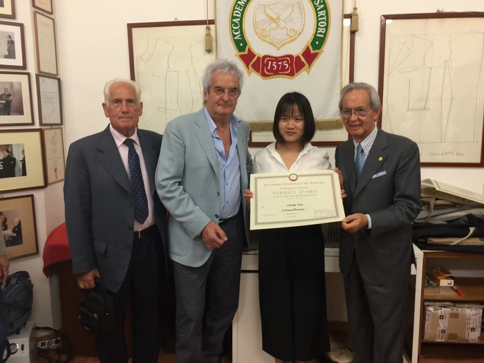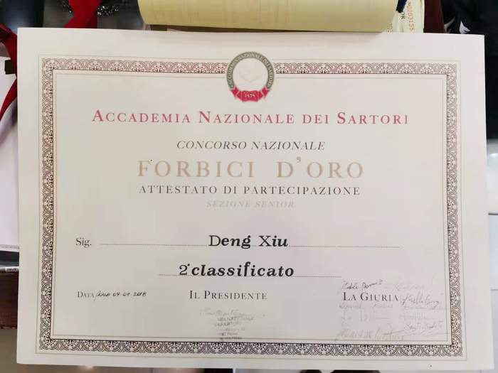 作为上海唯一一名参赛选手,邓秀斩获总决赛二等奖,并获得意大利国家裁缝师学会颁发的“一级裁缝师”证书。