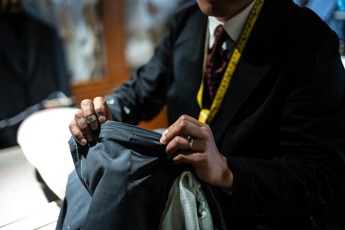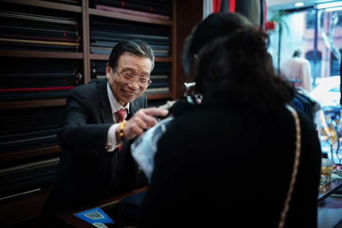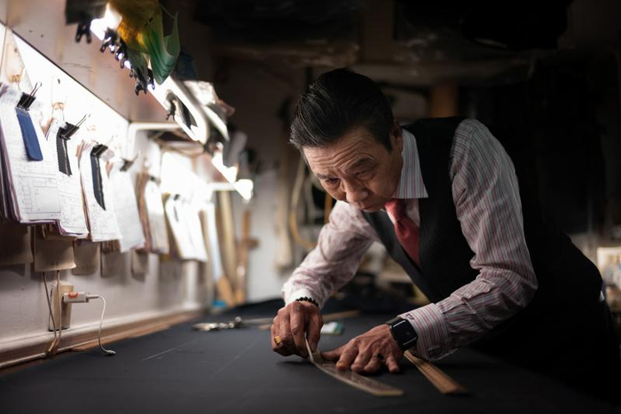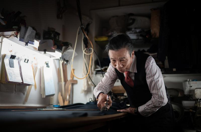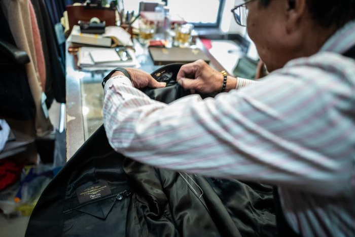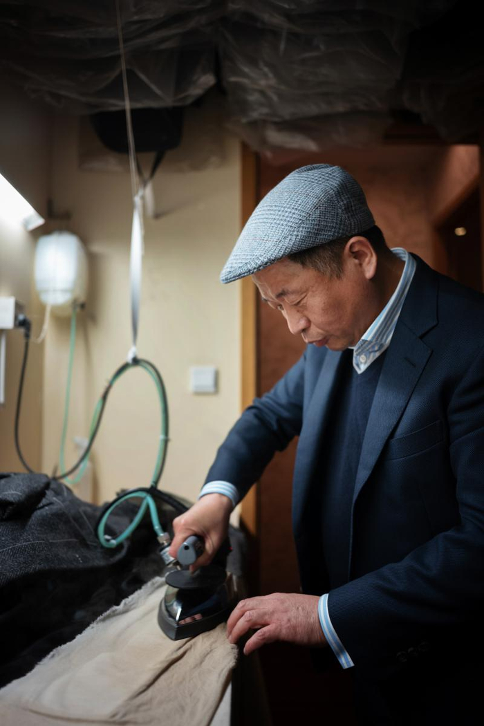 师傅跟熟客,像一对华尔兹舞伴,彼此有着轻巧贴合的节奏感。蒋先生转身、抬臂,包师傅察看衣服的每个细节,一丝不苟。包师傅的手滑过西装的领子、肩膀、腰线、下摆,两人像对暗号一般地不断低语。