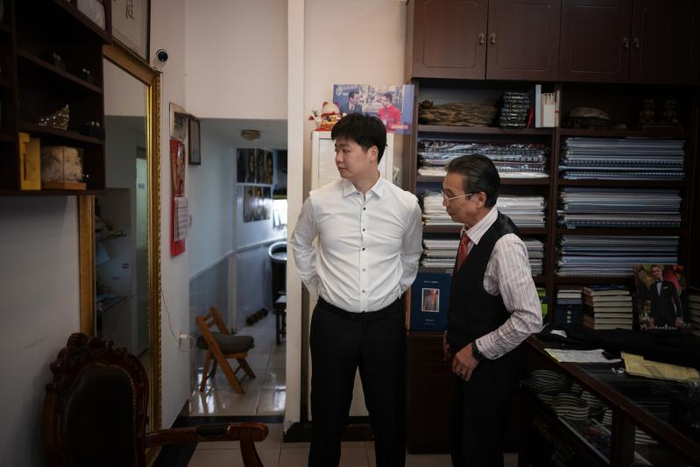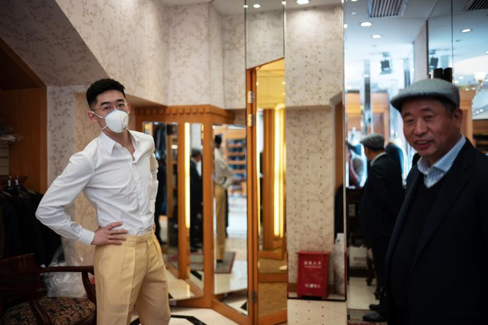 25日下午2点,茂名南路的W.W.Chan & Sons Tailor店里,大师傅包荣海正陪着帅气的“90后”蒋先生试西装。