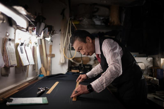 老江叫江利角卓也,是老板专门从日本请来的裁剪大师傅。老江从有着百年历史的日本文化服装学院毕业,后进入日本的老字号一番洋服学习定制西装,据说是被某杂志评为“日本十大裁缝”之一。小邓知道红帮裁缝的手艺学自日本,对于日本一流的传统裁缝是如何工作的,他充满了好奇与热情。