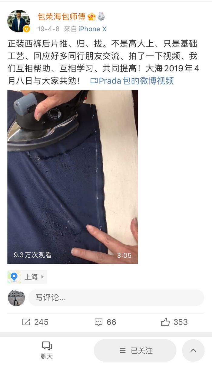 包师傅半信半疑,跟着年轻人,一手一脚学起怎么玩社交媒体。不曾想,转眼在微博就积累起了3万粉丝,成了网红“包荣海包师傅”。现在,时不时分享制衣工艺、完工作品,总能得到同行的共鸣、网友的追捧。一段由他演示的正装西裤推、归、拔的视频,点击率达到9万多。
