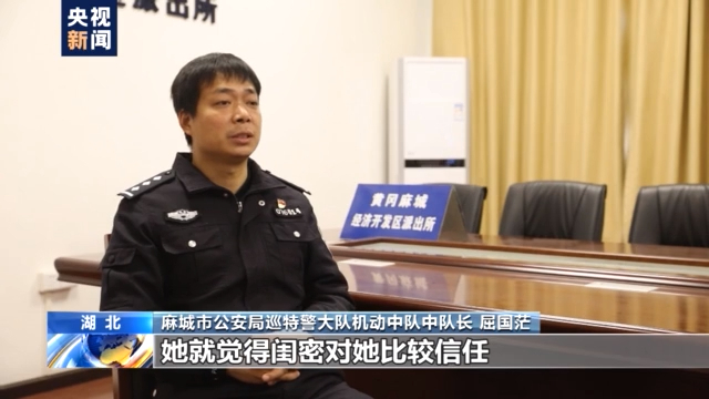 麻城市公安局巡特警大队机动中队中队长 屈国茫:中间有段时间嫌疑人手头比较紧,开始向受害人借款,受害人鉴于她们的关系就直接给她了。长时间也没有跟她要,她就觉得闺密对她比较信任,钱非常好借,她就萌生了一个念头,因为借的钱她总是要还,能不能把它骗过来,就是用其他的方式把它骗过来。