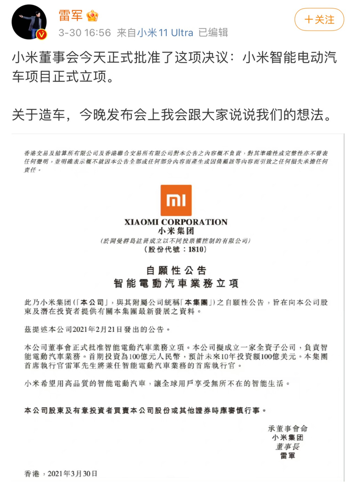3月30日,小米小米集团在港交所发布公告,正式宣布进入造车领域。
