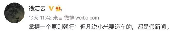 2020年,小米再传造车消息时,徐洁云在网上公开表示,“掌握一个原则就行:但凡说小米要造车的,都是假新闻。”但市场对这则否认似乎并不买账。