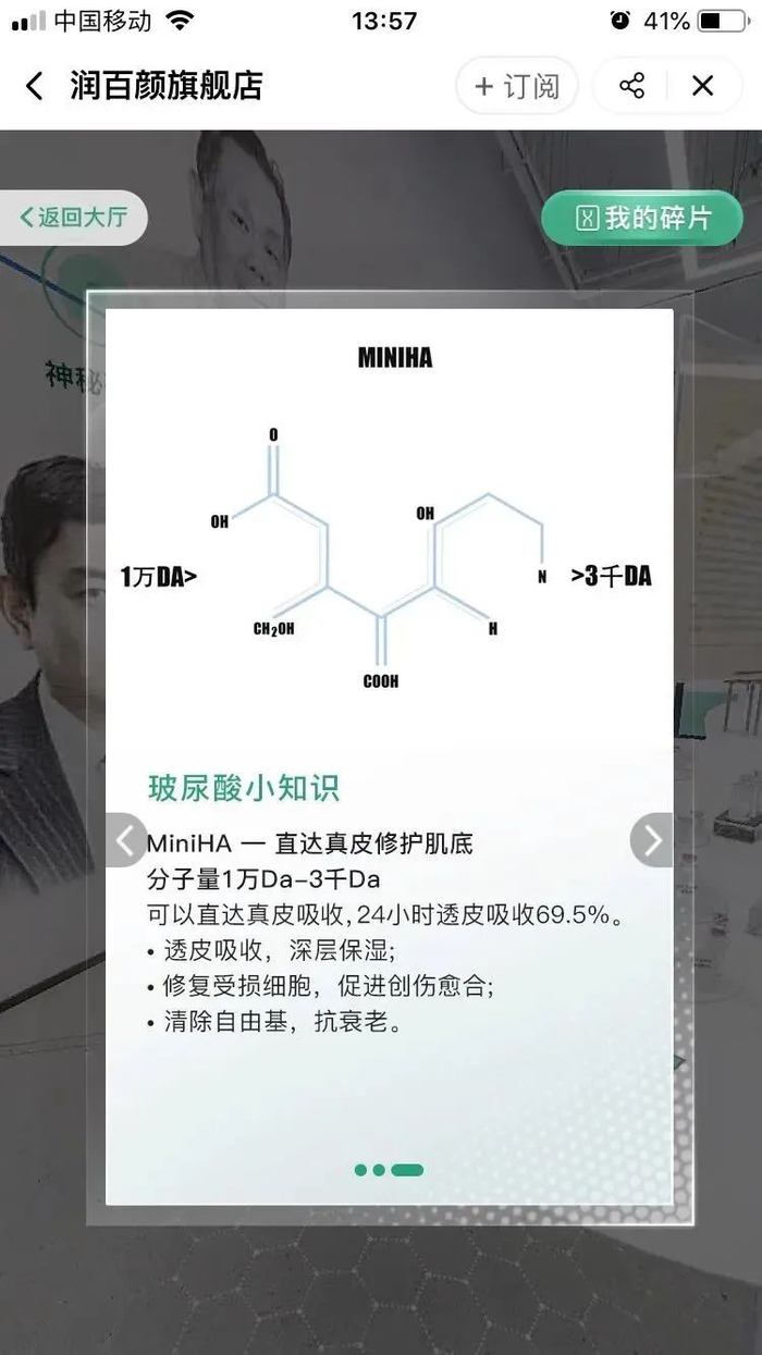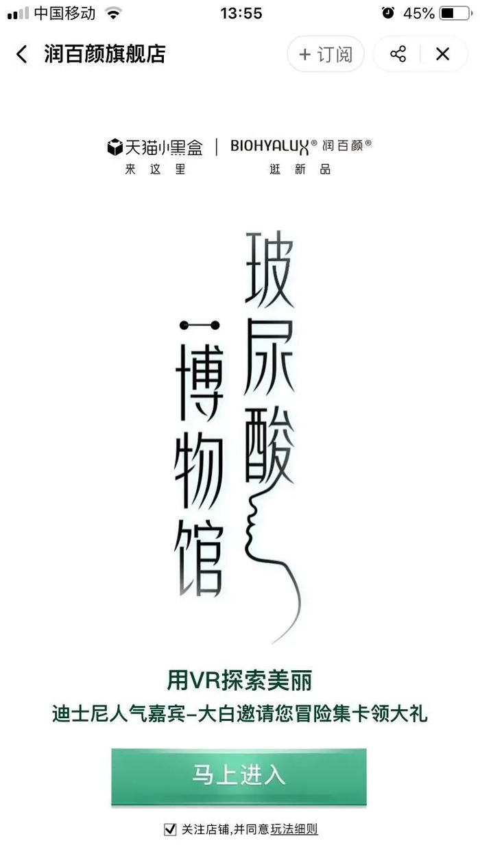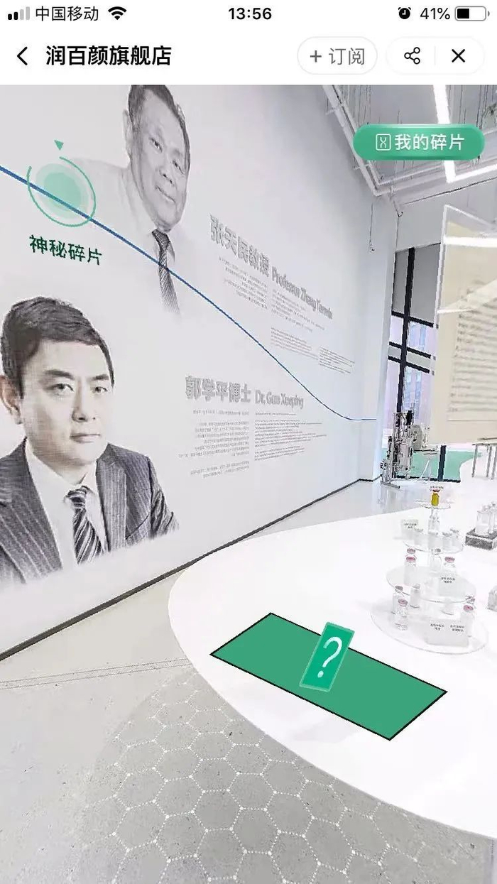 同时联动线上,将润百颜的玻尿酸博物馆以数字化的形态搬到了淘宝二楼的品牌ZONE,消费者可以通过探索前的互动小测试更清楚自己的肤质状态,可以在博物馆里获悉到玻尿酸小知识及品牌研发历史,更了解新品功效和针对的焦虑痛点,还可以通过探索博物馆收集神秘碎片,获得新品福利。