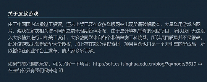 但是,既然把游戏放在Steam这个商业平台上来了,玩家们自然会以正常游戏的标准来要求,再加上“清华”这个词汇在社会的影响力,会引发争议完全是可预见的。只是大作业的话,放在分享类社区论坛明显更合适,吸取这个教训吧。