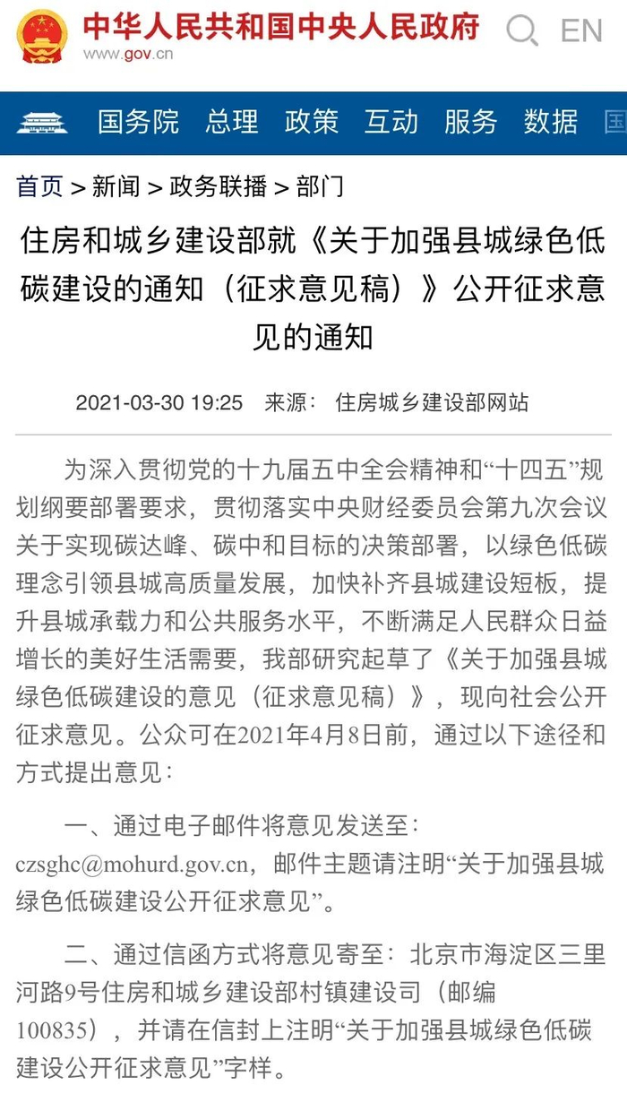 3月29日,住建部对外发布《关于加强县城绿色低碳建设的通知(征求意⻅稿)》(以下简称征求意见稿)公开征求意⻅。意见稿提到,限制县城居住建筑高度。县城居住建筑高度要与消防救援能力相匹配。县城新建住宅以6层为主,6层及以下住宅占比应不低于75%。县城新建住宅最高不超过18层。确需建设18层以上居住建筑的,应严格充分论证,并加强消防应急、市政配套设施等建设。