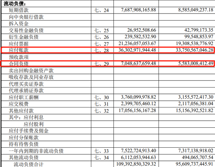在流动负债里,应付票据为21.36亿元,同比增加10%,应付账款为363.03亿元,同比增加7.6%,合同负债为70.49亿元,同比增加26.26%。
