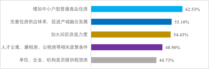 在住房方面,62.53%的青年最希望增加中小户型普通商品住房;55.10%的青年希望完善住房供应体系,促进产城融合发展;54.43%的青年希望加大旧区改造力度;45.11%的青年希望以公租房为重点扩大供给。48.90%的租房青年最希望放宽人才公寓、廉租房、公租房等政策;44.73%的租房青年希望单位、企业、机构能提供租赁房。此外租房成本、通勤距离也是青年在租房中面临的困境和压力。