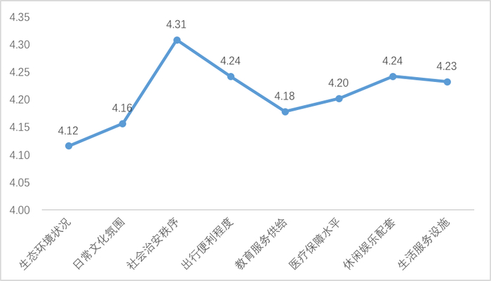 上海青年对魔都满意度较高。若5代表最高值,满意度从高到低依次是社会治安秩序(4.31)、休闲娱乐配套与出行便利程度(4.24)、生活设施服务(4.23)、和教育服务供给(4.18)、日常文化氛围(4.16)。